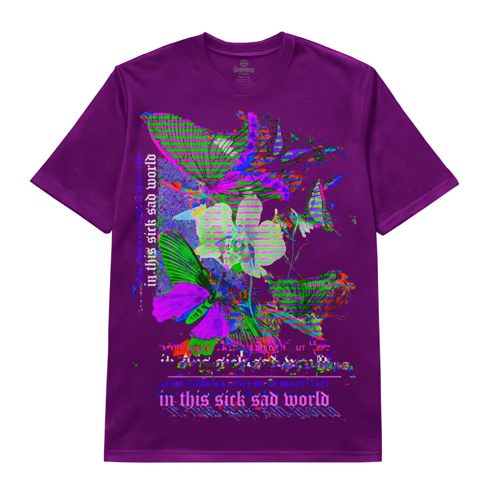 A raw fusion of glitch aesthetics and fragile beauty. This tee captures the contrast between chaos and hope, where distorted butterflies and broken visuals reflect a world that feels heavy—yet still holds small flashes of meaning. Designed for those who find art in imperfection and wear their emotions without filters.
