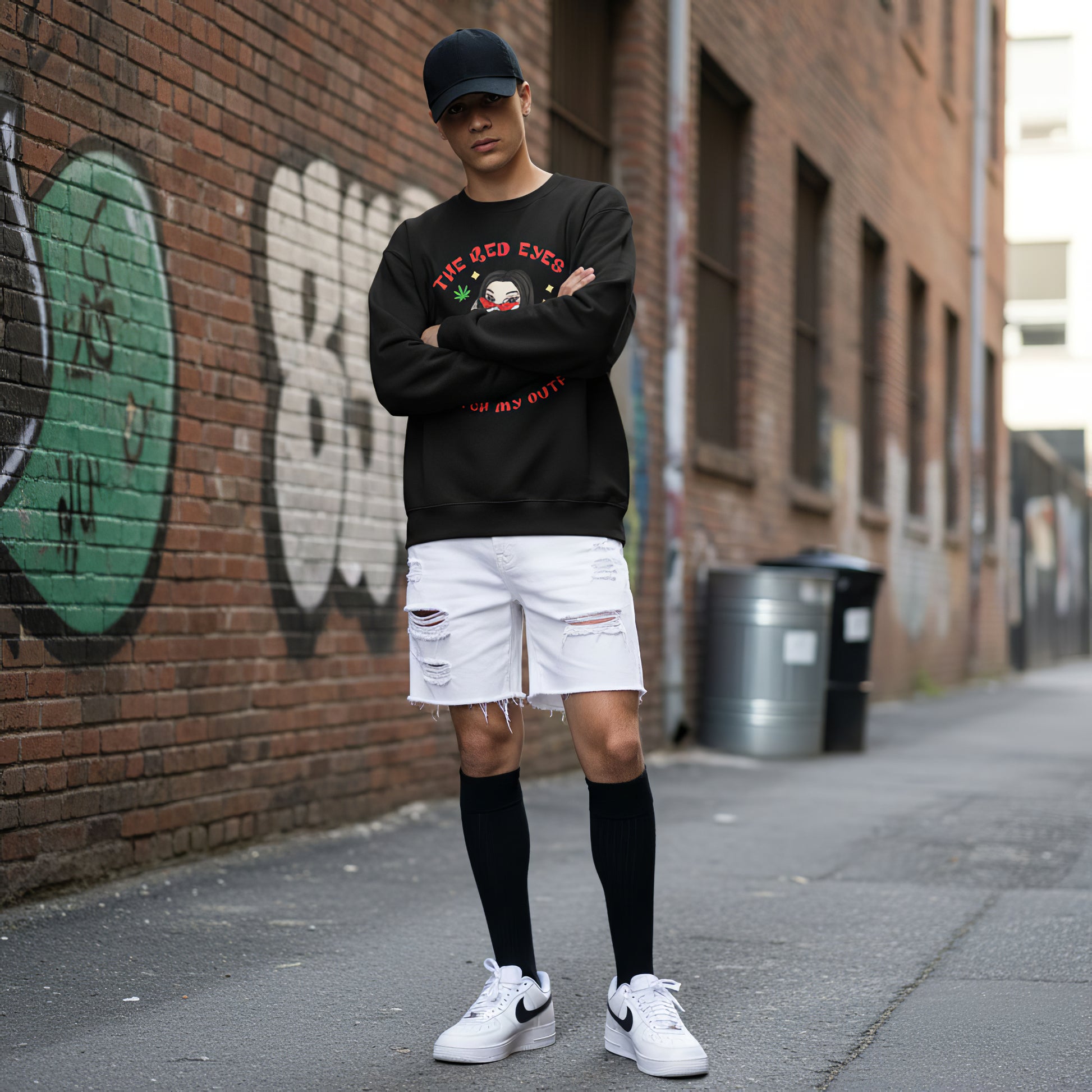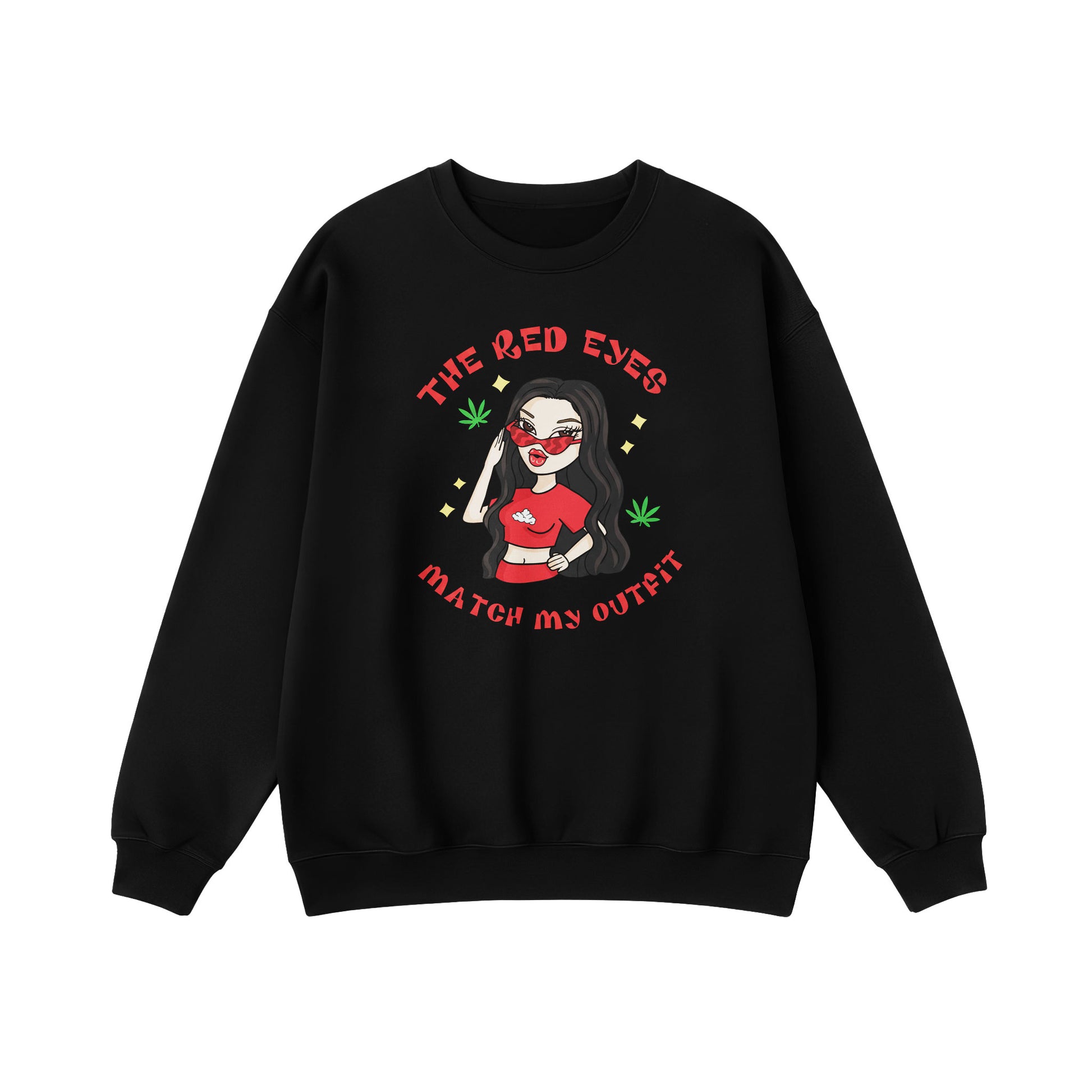 The “Red Eyes Match My Outfit” Sweatshirt delivers a cheeky fashion moment through bold cartoon artwork and retro bubble lettering. Styled on a clean black crewneck, it blends humor, attitude, and playful character design for a streetwear-friendly look that stands out without trying too hard. Soft, cozy, and easy to pair with cargos or denim, this piece adds personality to everyday fits and brings a confident, tongue-in-cheek vibe to casual styling.