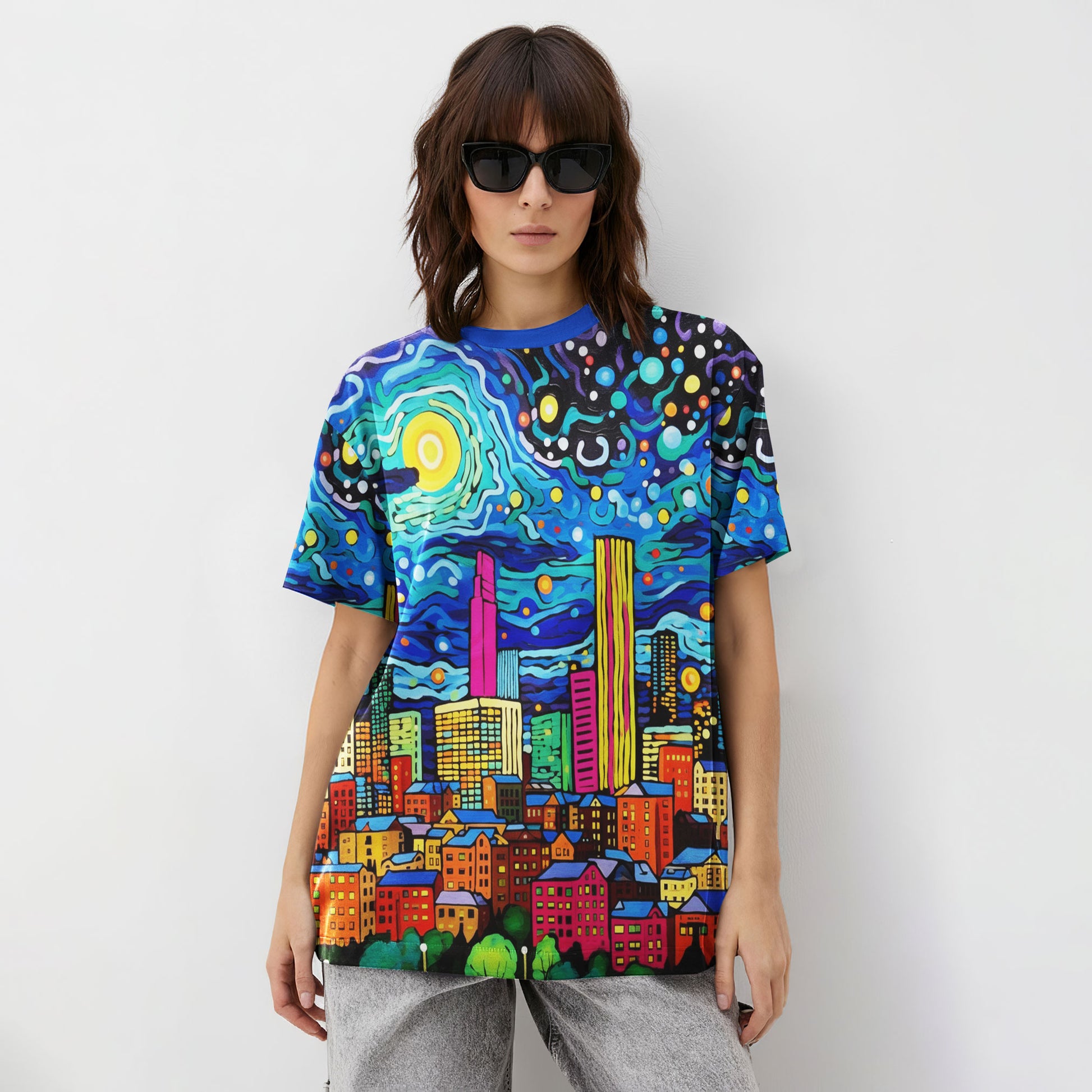 The Starry Skyline Dream Doodle All-Over Print Unisex T-Shirt captures the magic of the night sky meeting the city lights. Inspired by cosmic swirls and neon architecture, this tee turns urban chaos into a masterpiece of movement and color. Made with soft, breathable fabric and printed edge-to-edge for full vibrancy, it’s the perfect fusion of art and streetwear — made for dreamers who live life in technicolor.