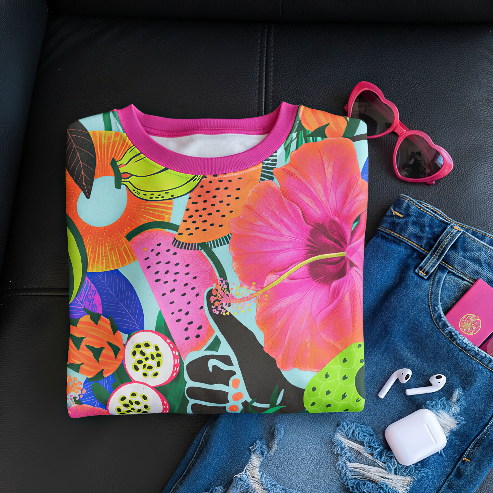 The Tropical Fruits & Flowers Sweatshirt brings bold island vibes to your everyday style. Packed with vibrant fruit and hibiscus artwork in full color, it wears like a piece of tropical art. Soft, breathable, and easy to pair with denim, shorts, or streetwear fits, it delivers vacation energy year-round without ever leaving the city.