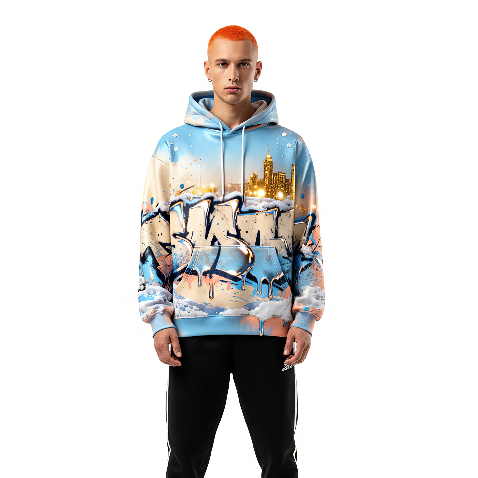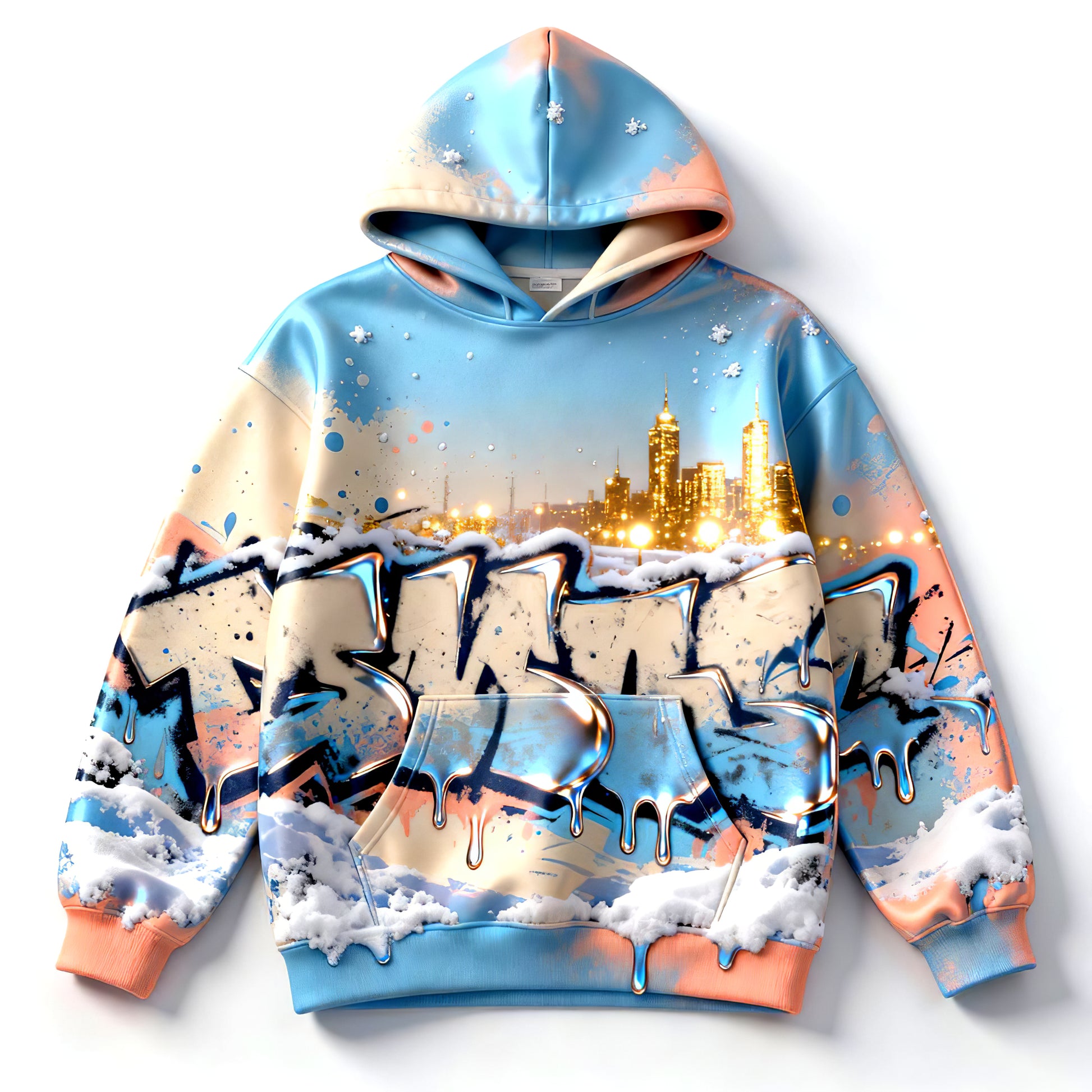 Winter Mirage Snowfall City Graffiti Luxury Hoodie brings a bold winter aesthetic to your streetwear lineup. The design blends frosted skyline lights, chrome-style graffiti, and soft pastel snow tones for a cinematic cold-season vibe. Crafted for comfort and statement appeal, this hoodie delivers a premium feel while keeping your fit effortlessly standout in any weather.